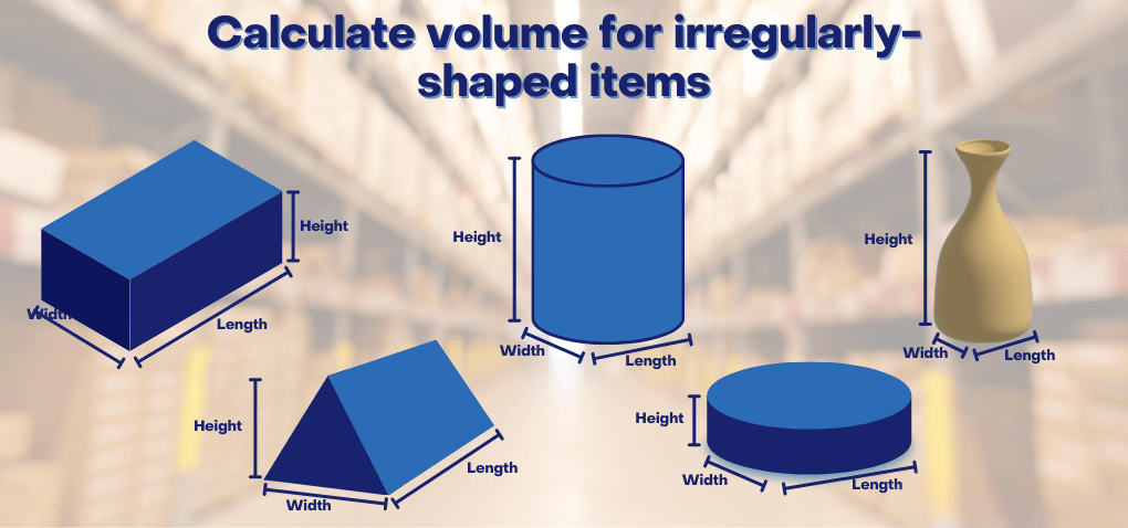 To measure the volume of irregularly shaped items for shipping, measure the longest, widest, and tallest dimensions to determine length, width, and height. Consider the smallest box that can fit the item as its volume for calculation.